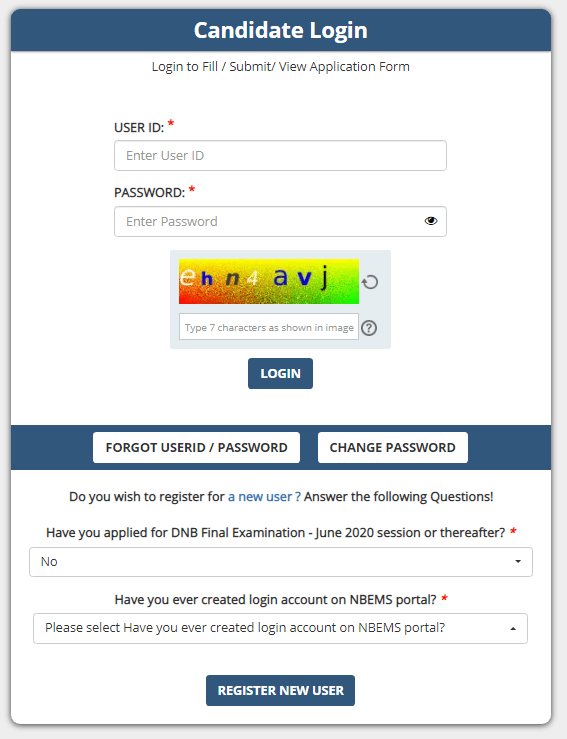 - Option 1 : If candidate has already appeared for DNB Final Examination –June 2020 or thereafter?. Then, they need not register again. Use username and password to login and continue to fill the form.